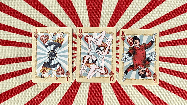 Se acerca el CIRCO… Reviva los recuerdos de la infancia cuando asistía al circo cuando era niño. ¡Las vistas, los olores, la emoción! Intentamos poner todo eso en esta baraja multiusos, adecuada para todas tus necesidades de naipes. Un diseño especial de fondo con sangrado completo para el cardista. Tarjetas de trucos extra para el mago. Fácil de leer para jugar al póquer o a tu juego de cartas favorito. Y se realiza como una impresión única y limitada, adecuada para el coleccionista más exigente.