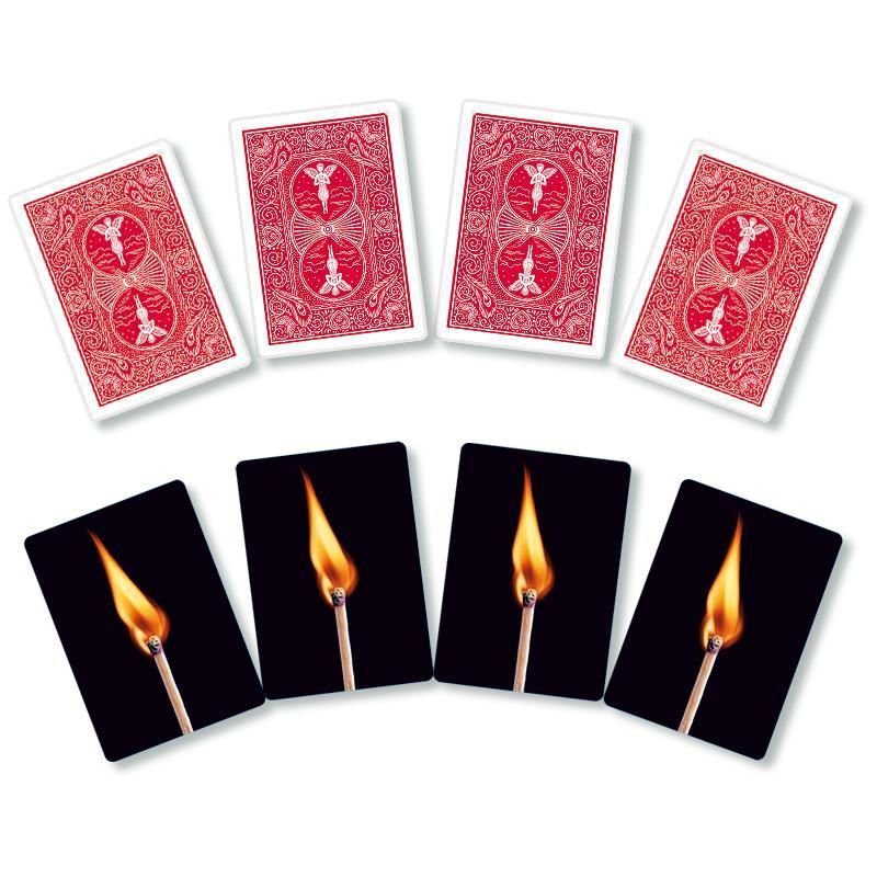 El mago habla de cómo la magia puede influir en la realidad y muestra al espectador 4 cartas. Cada una de las cartas tiene una hermosa imagen de una cerilla encendida. Las cartas se muestran una por una y se colocan boca abajo en la palma de la mano del espectador. Ahora el mago enciende una cerilla real y, tras dejar que la llama brille durante unos segundos, la apaga. Explica que esta simple acción ha influido mágicamente en las cartas. Las cartas que el espectador sostenía están volteadas, e increíblemente en cada una de ellas, ¡¡¡ahora aparece la imagen de un fósforo que acaba de apagarse!!!