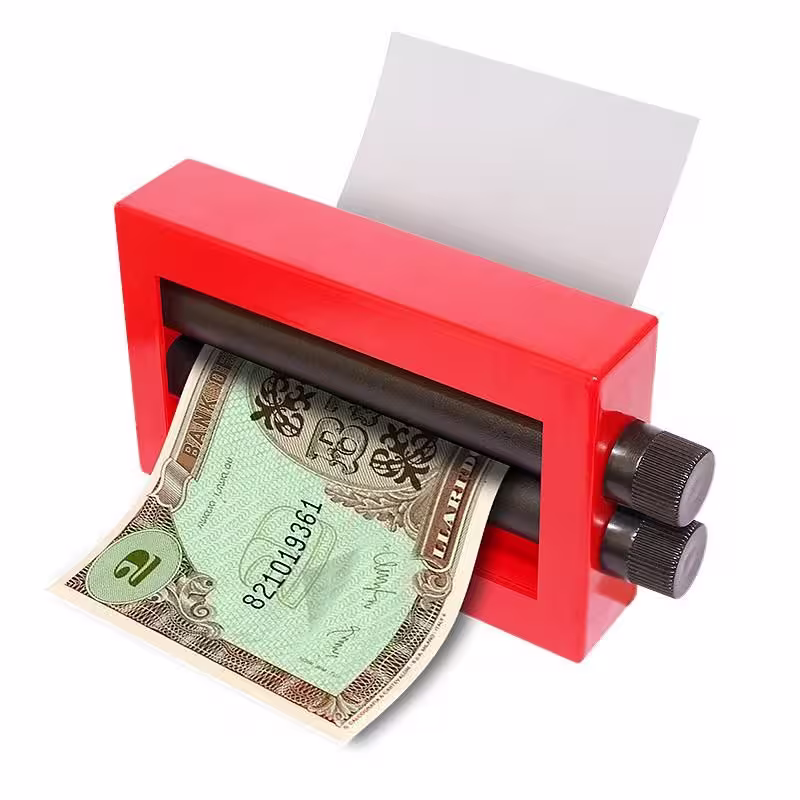 Este es uno de esos efectos que despiertan la imaginación de cualquiera. Coloco un simple trozo de papel entre los rodillos de esta impresora de billetes portátil, giro la ruedecita… y poco a poco, el papel blanco se convierte en un billete real ante los ojos del espectador.