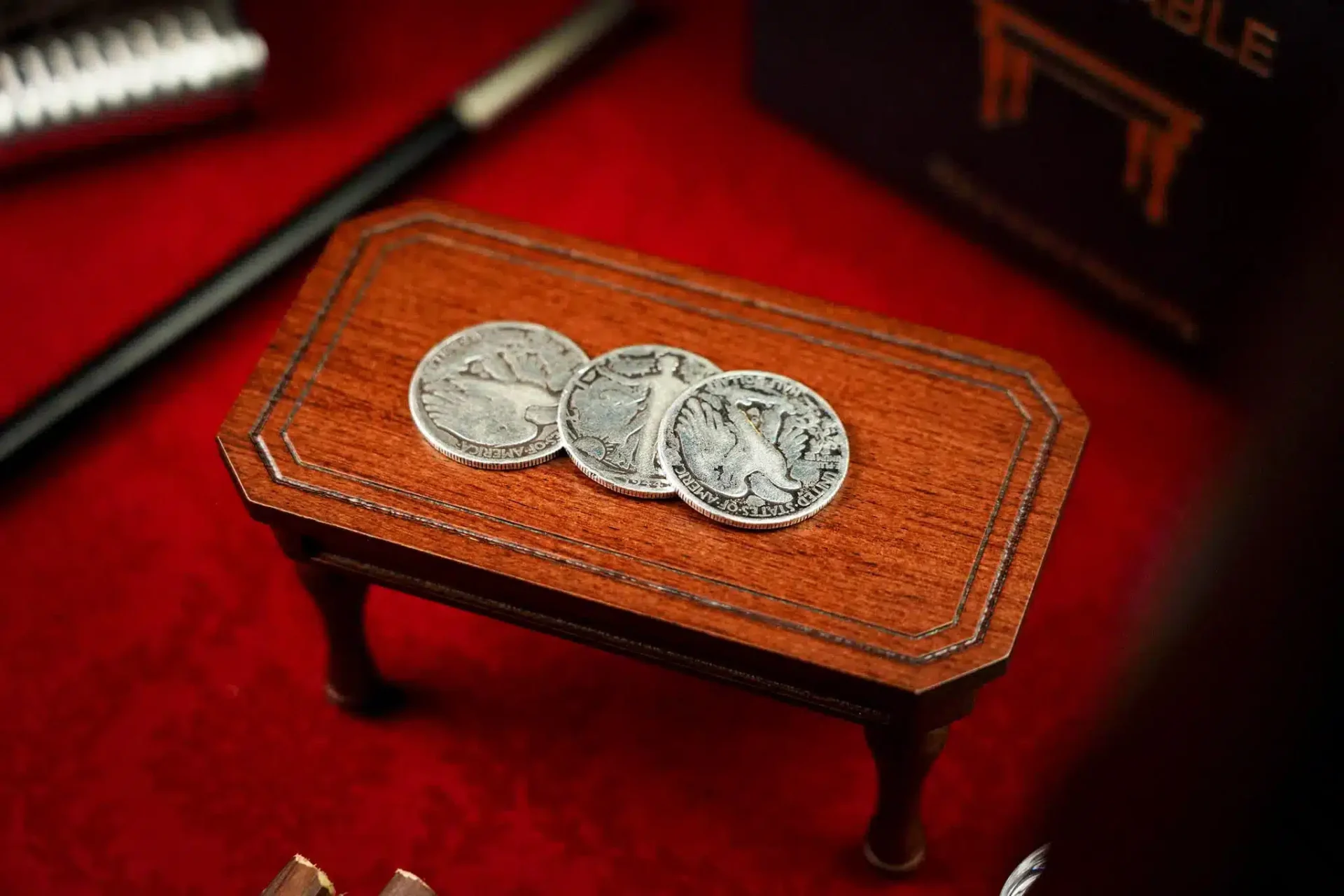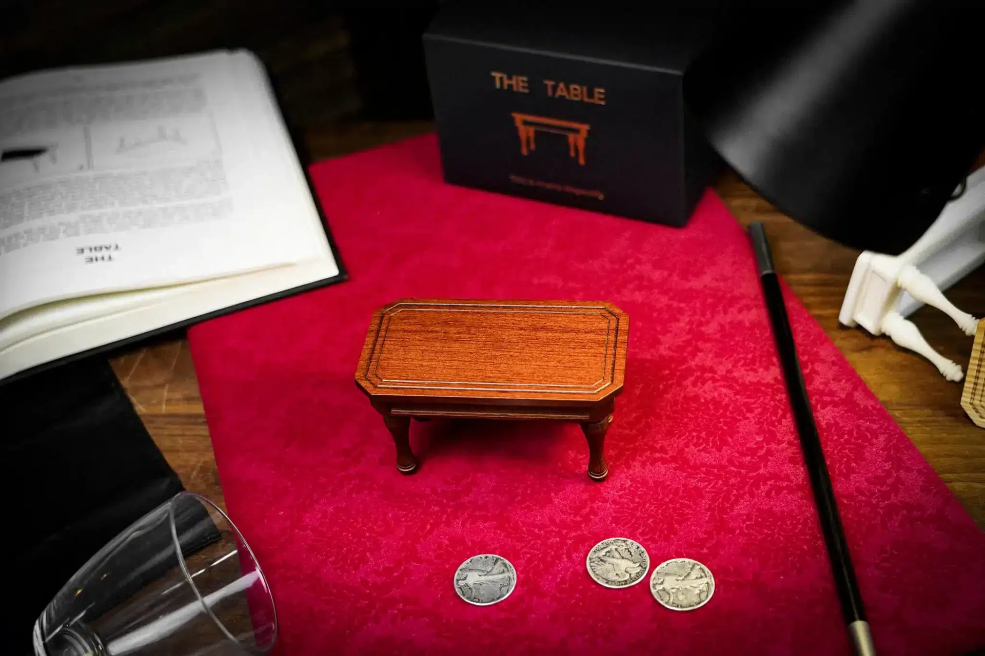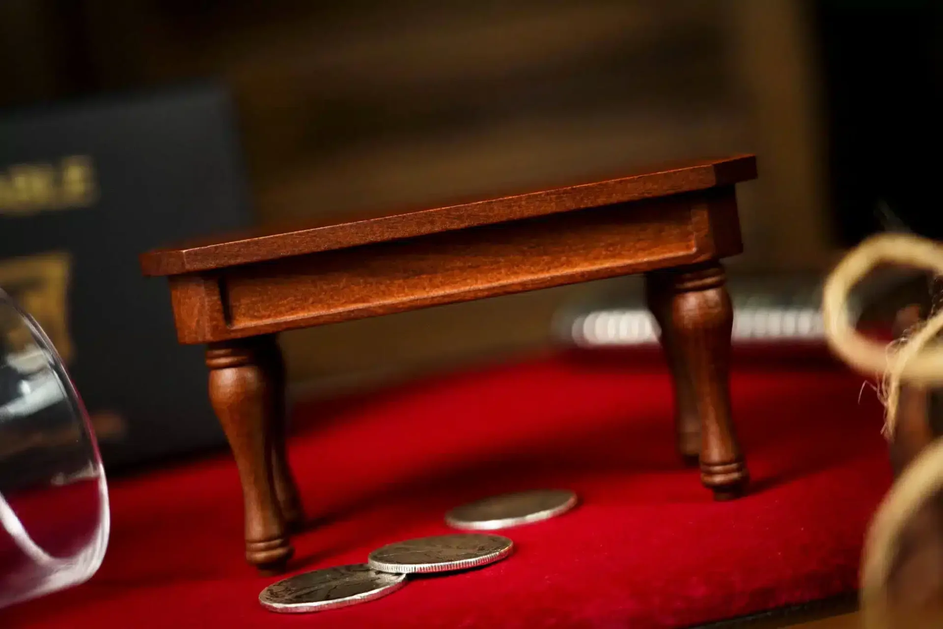 Muestra una pequeña mesa de madera ornamentada que se puede entregar para examinarla. Luego introduces 4 medios dólares y una a una haces que las monedas penetren visiblemente en la mesa sin tapa. Al final de la actuación, se cubre la mesa con seda negra y, con una suave presión, se hace que la mesa penetre en la superficie de trabajo o desaparezca por completo.