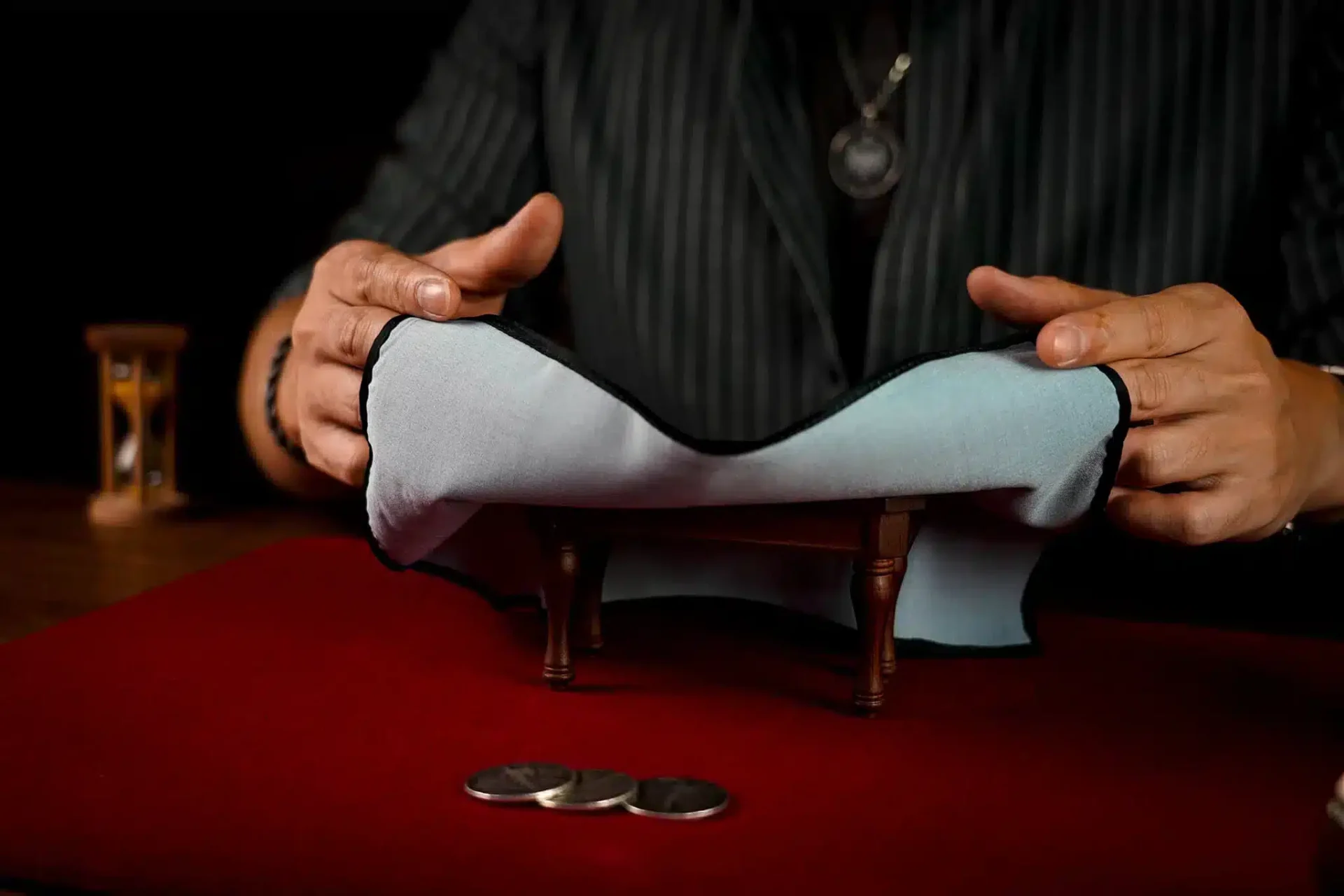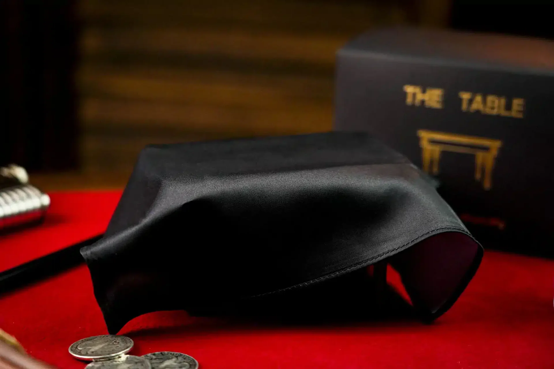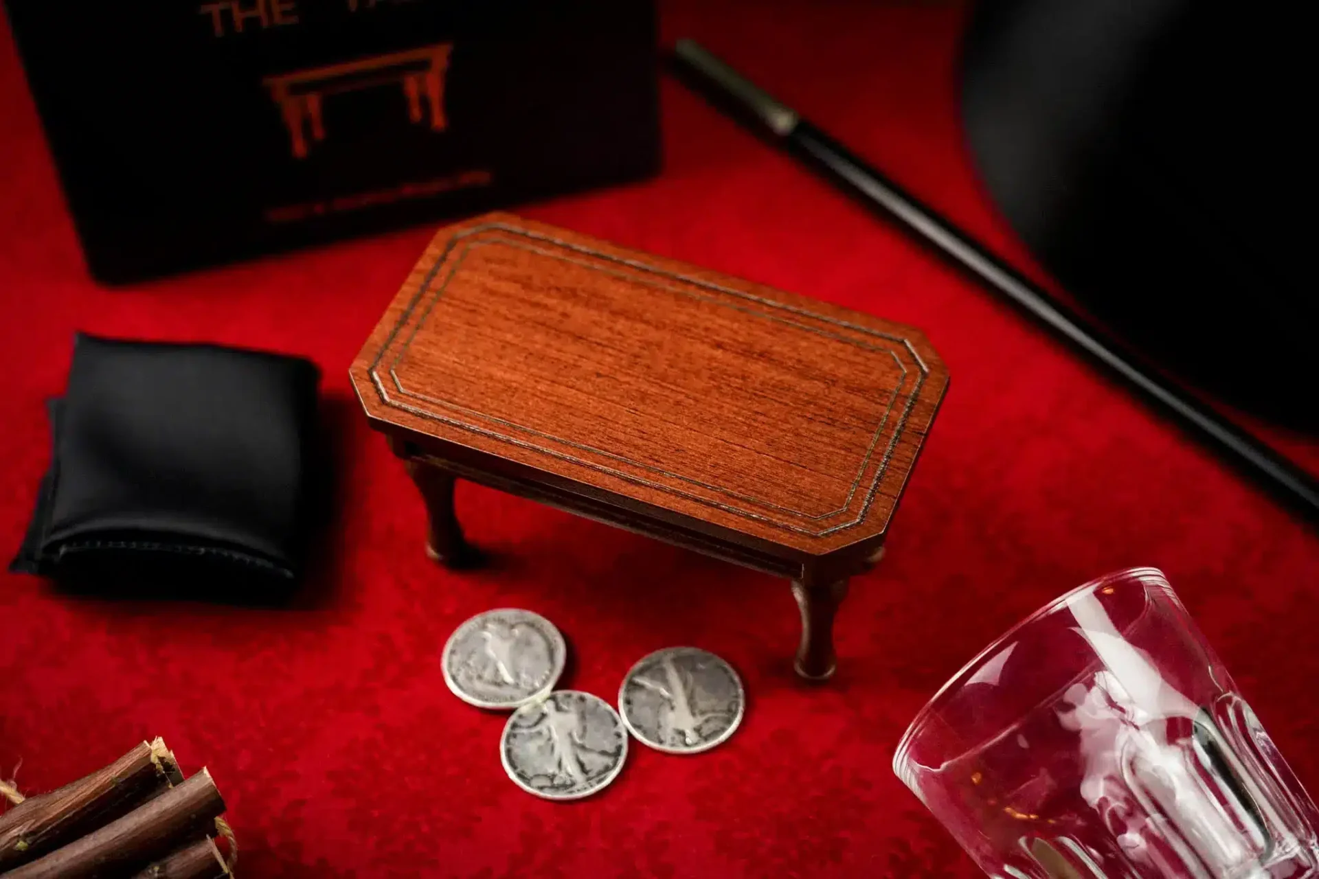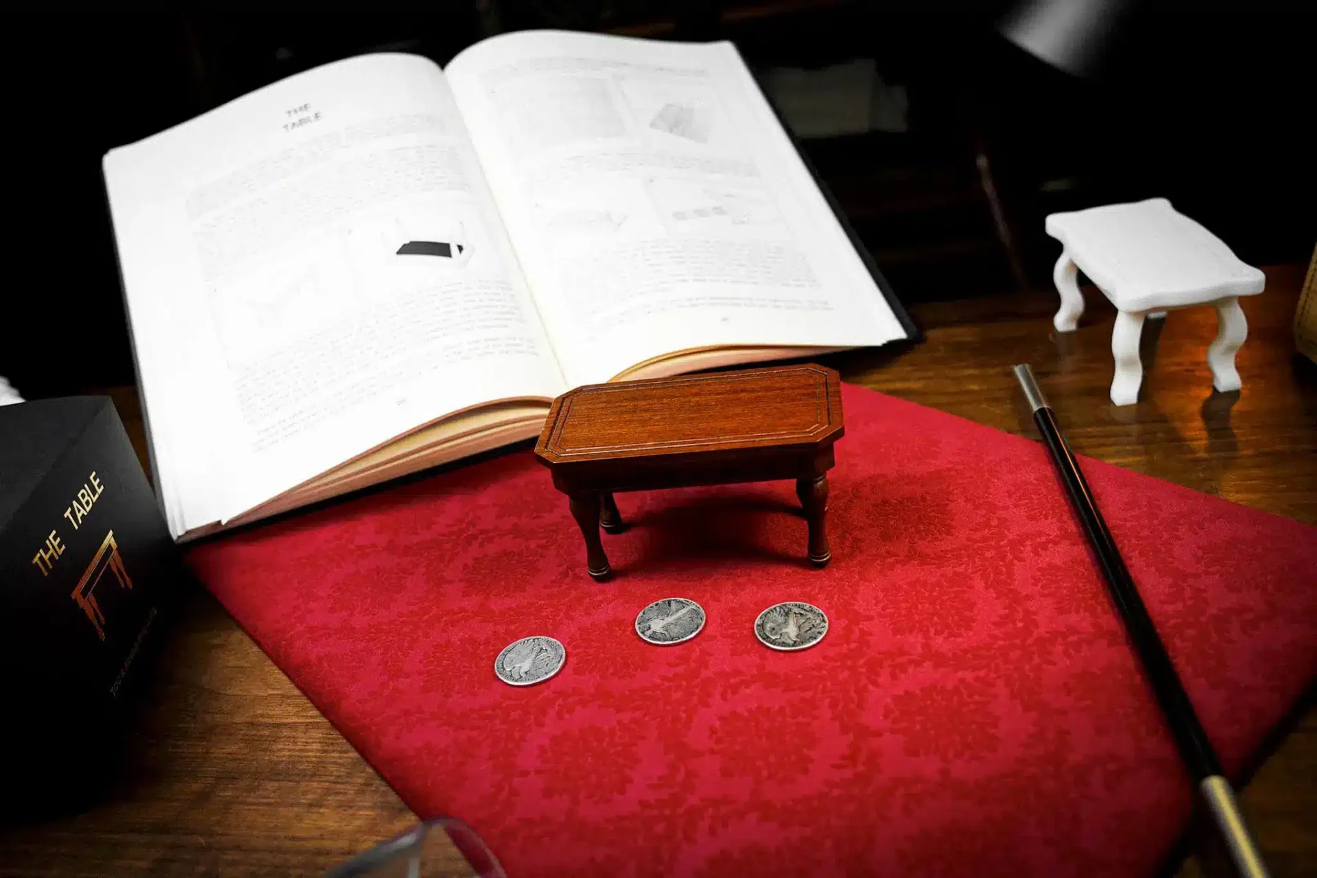 Muestra una pequeña mesa de madera ornamentada que se puede entregar para examinarla. Luego introduces 4 medios dólares y una a una haces que las monedas penetren visiblemente en la mesa sin tapa. Al final de la actuación, se cubre la mesa con seda negra y, con una suave presión, se hace que la mesa penetre en la superficie de trabajo o desaparezca por completo.