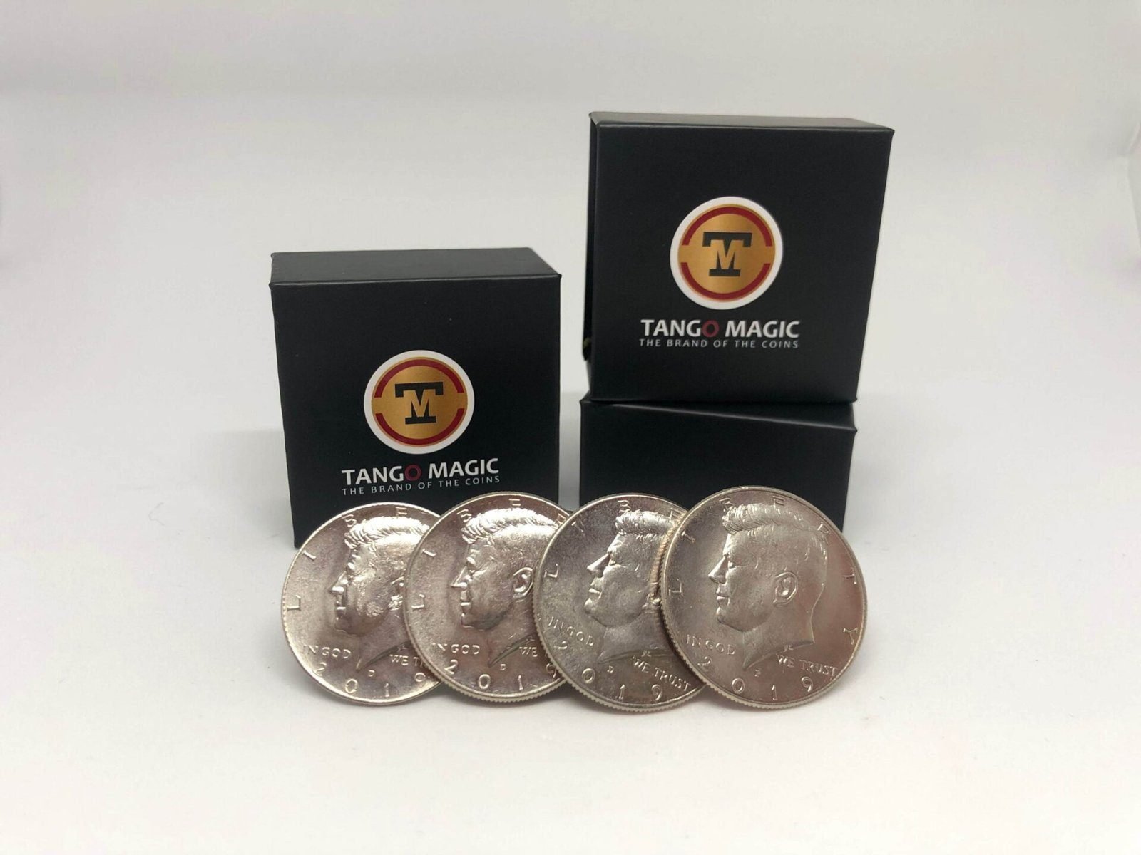 El mago muestra cuatro monedas de Medio Dollar Kenedy en su mano, luego toma una de las monedas y se la lleva al bolsillo. Tan pronto como abre la mano, vuelve a tener 4 monedas.