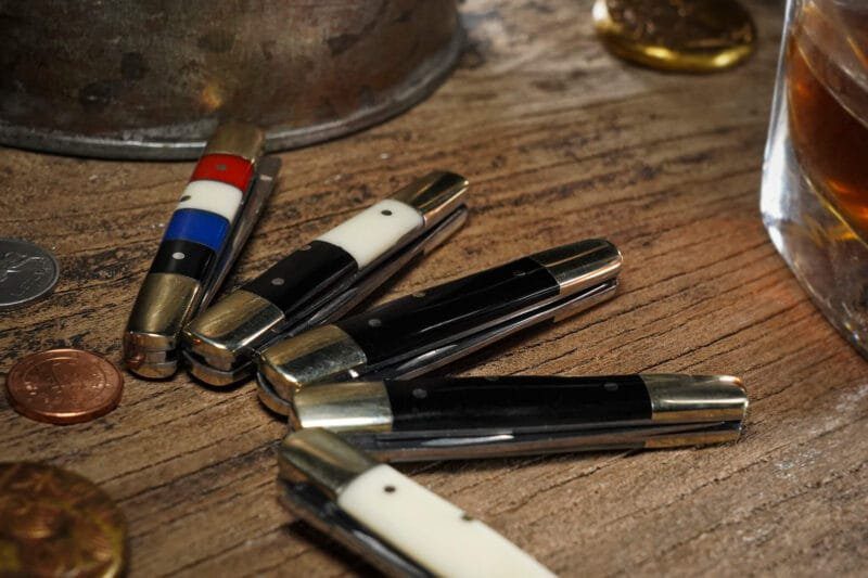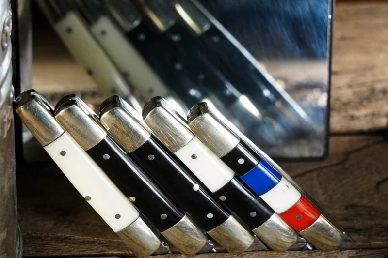 Navajas: Hoja de hierro con mango de resina acrílica incrustada en acero inoxidable.