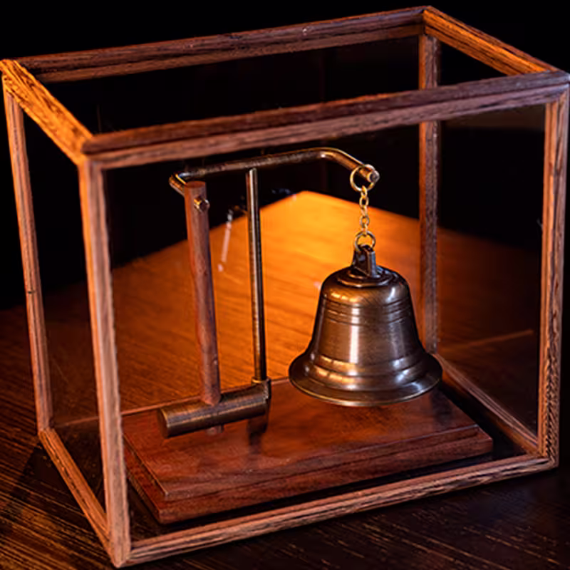 Revisado y testado: el martillo bascula y golpea la campana gruesa con un timbre limpio y sostenido, creando un clímax de sesión muy teatral. El sistema se apoya en una base de madera hecha a mano y resulta examinable; incluso puede montarlo el propio espectador sin descubrir nada. El Spirit Cabinet incluido funciona como vitrina y como utilería para enmarcar el acto.