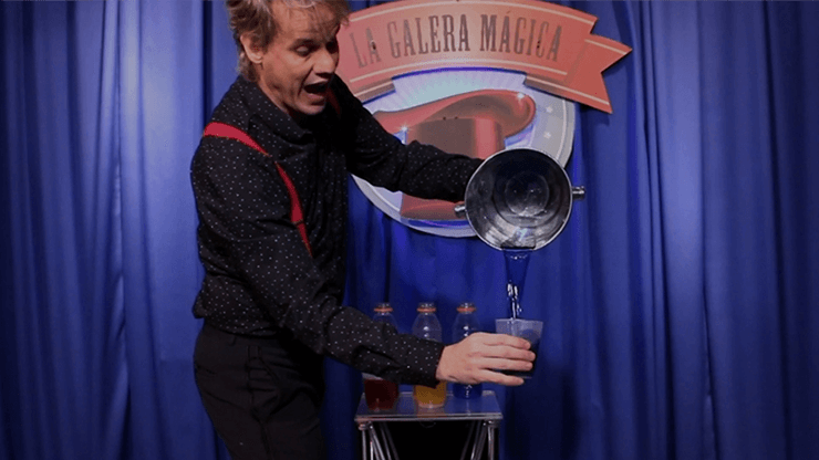 Con un movimiento mágico, el mago saca un vaso y lo llena exclusivamente con el líquido azul. Luego, hace lo mismo con el líquido amarillo y, finalmente, con el rojo.