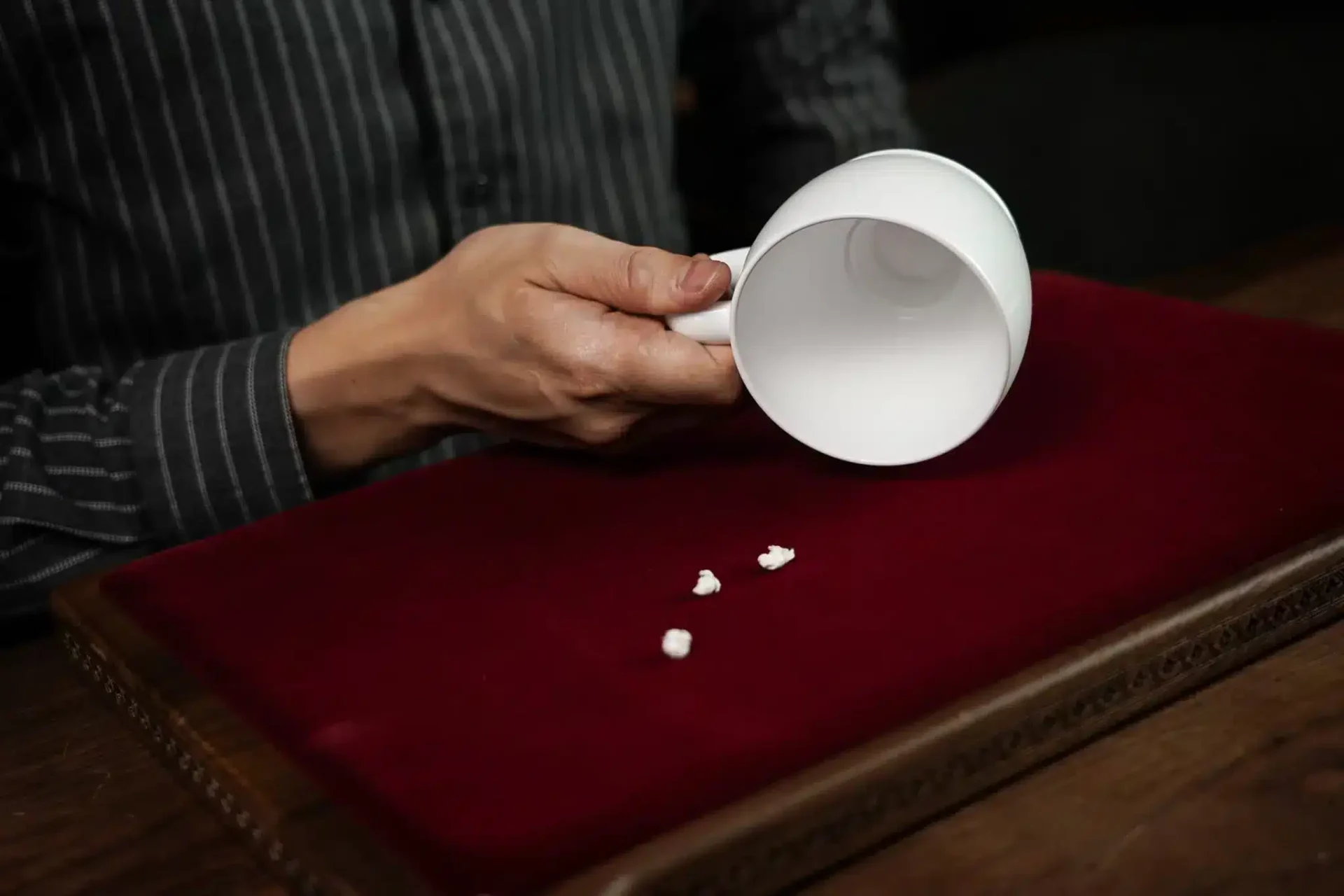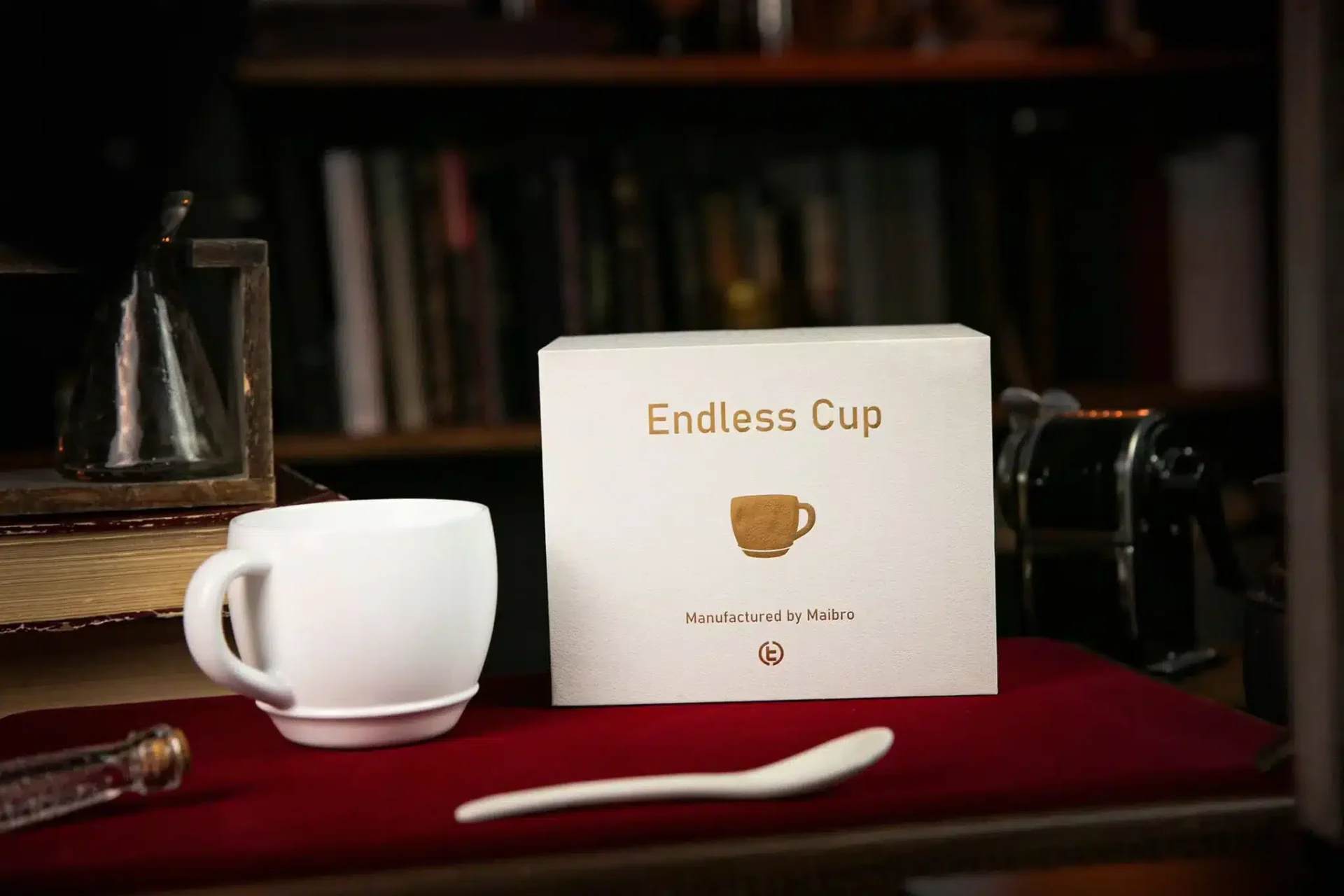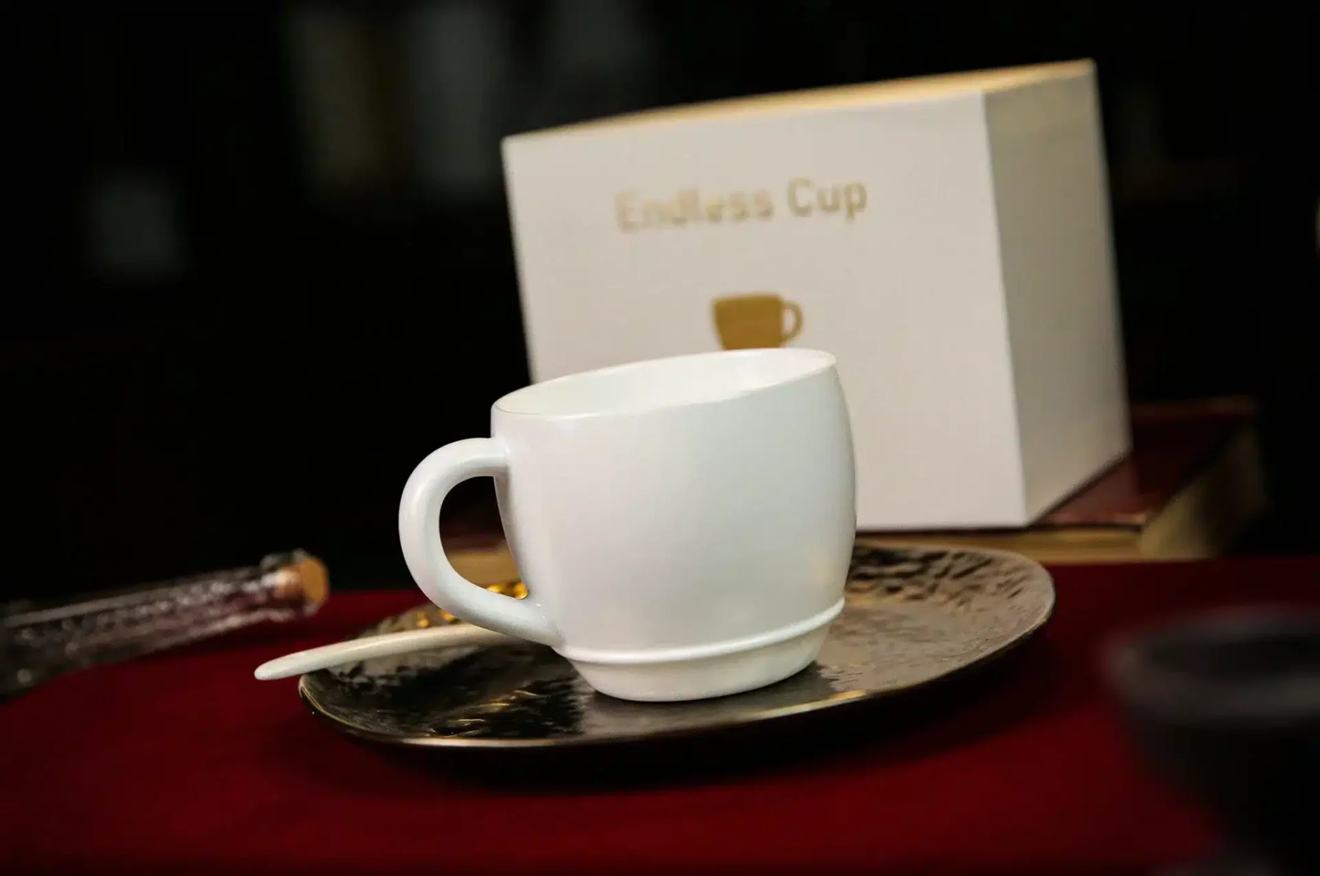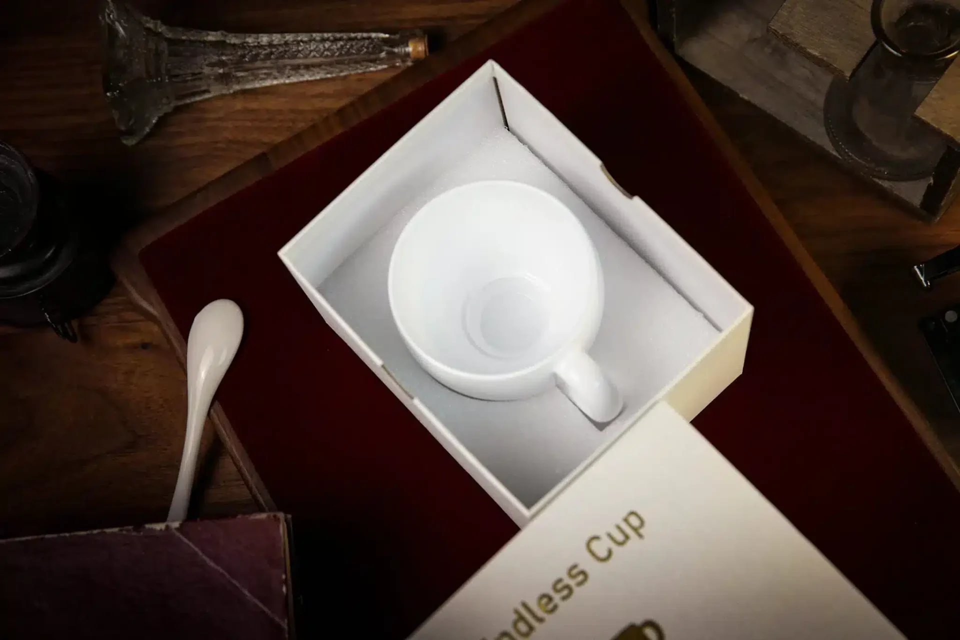 La «Endless Cup» parece una taza de café o cerámica común y corriente, pero puede ocultar casi media taza de líquido sin derramar. Te permite hacer que el líquido fluya hacia la taza cuando lo necesites. Con la «Endless Cup,» puedes realizar una variedad de rutinas, que incluyen: