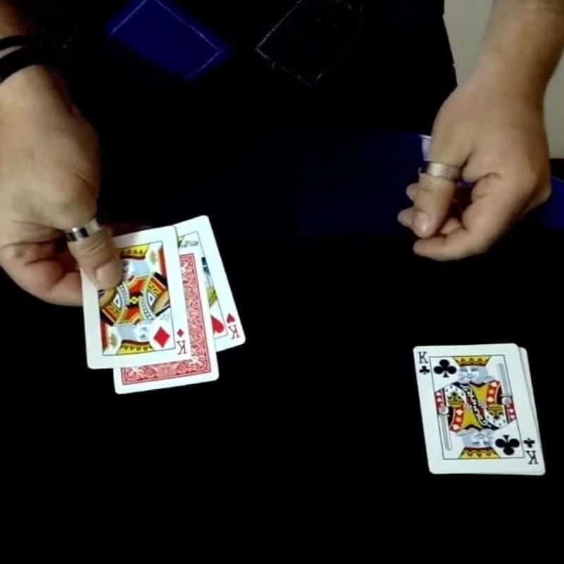 El mago recoge los 2 reyes con la carta del espectador en el medio y con un simple gesto mágico, la carta del espectador desaparece instantáneamente para encontrarse entre los 2 reyes negros previamente apartados. ¡Todo se realiza mágicamente y visiblemente sin ningún movimiento sospechoso!