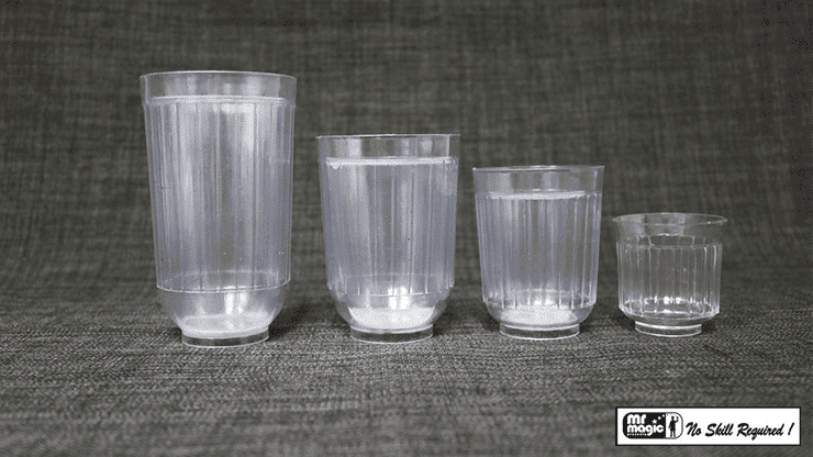 Sobre la mesa del artista se exponen cuatro vasos de plástico de diferentes tamaños. Se descubre que la taza más grande contiene leche llena hasta el borde. El artista vierte la leche en una taza más pequeña, ¡la leche no se derrama! Luego, el artista vierte la leche en una tercera taza más pequeña y luego en una cuarta taza más pequeña , ¡la leche no se derrama en ninguno de los casos! Así, al público le parece que la cantidad original de leche, lenta y mágicamente disminuida a una cantidad muy pequeña… ¡esto también se puede hacer a la inversa!